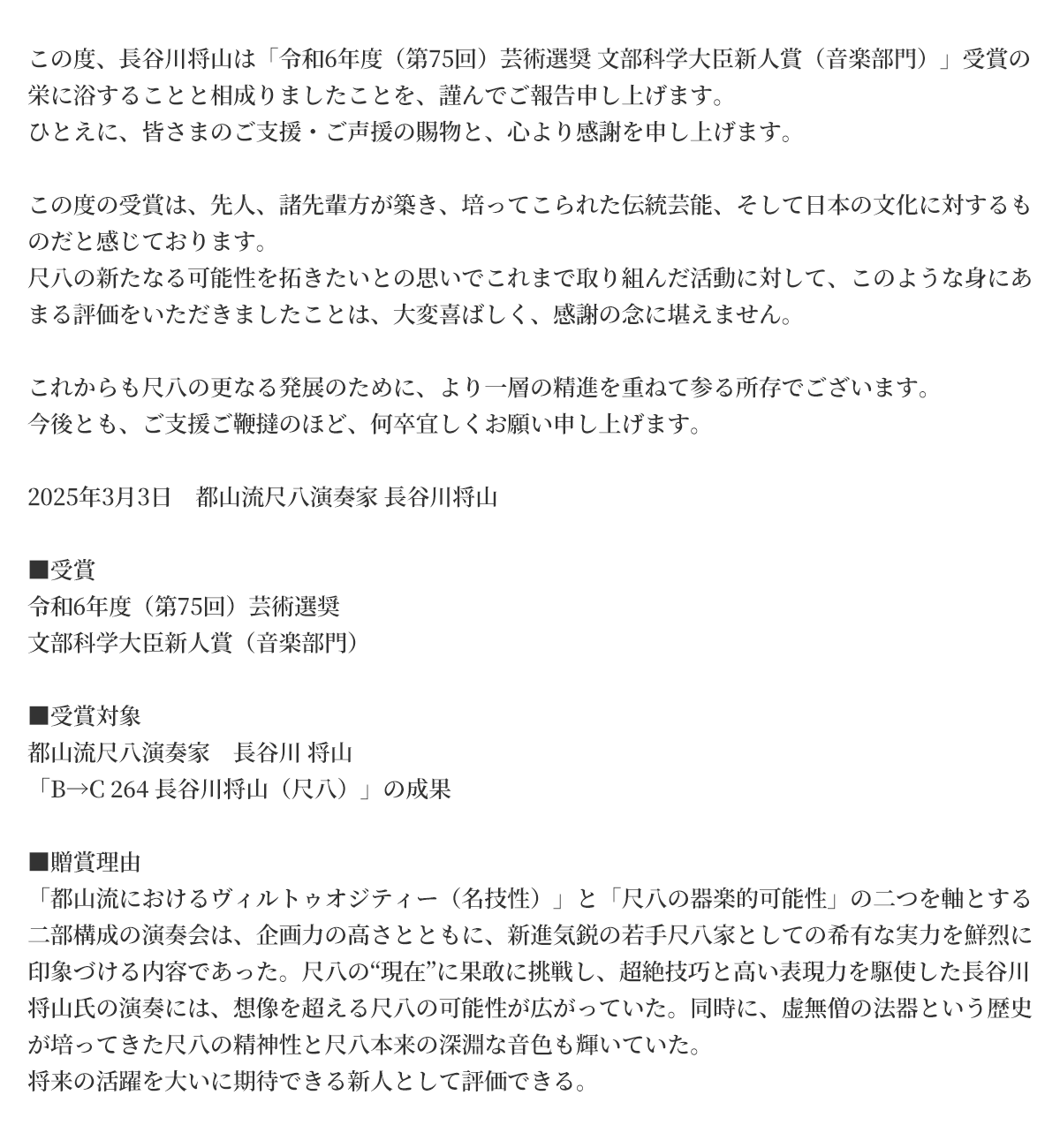 研究活動により裏付けられた細緻な作品解釈と学究的なアプローチで、尺八音楽の新たな可能性を拓いている。